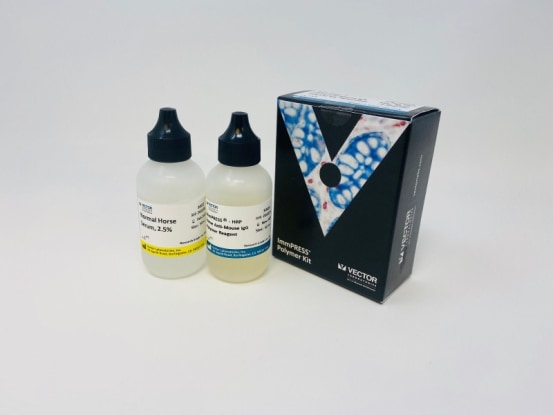 The ImmPRESS™ polymerized reporter enzyme staining system uses novel conjugation and micropolymer chemistries to create a highly sensitive, ready-to-use, one-step, biotin-free detection system. This unique micropolymer of highly active enzyme (peroxidase or alkaline phosphatase) is attached to our affinity purified secondary antibodies, producing reagents with outstanding sensitivity and low background.